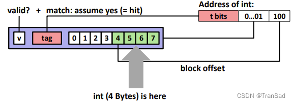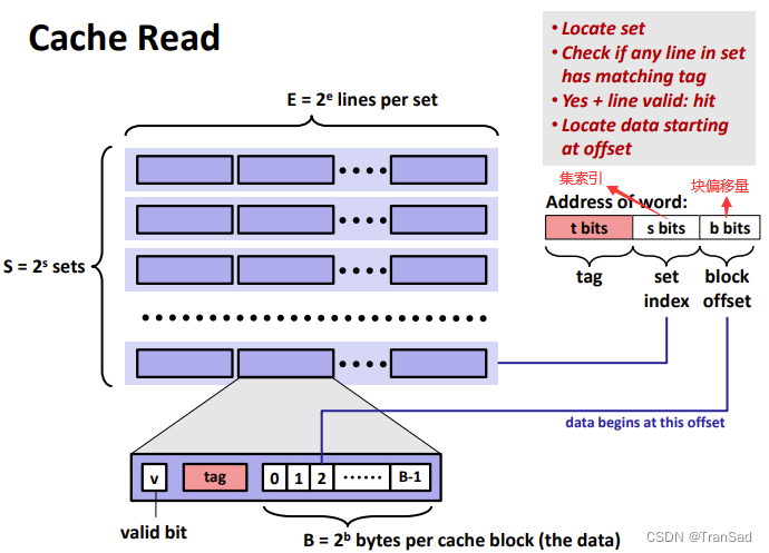 如上图所示,通常地址会被划分成3部分:块偏移量(block offset)、集索引(set index)和标签(tag)。