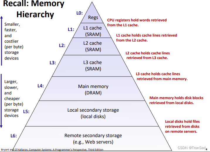 在讲缓存之前,首先要了解计算机中的内存结构层次Memory hierarchy。也就是下图金字塔形状的结构。