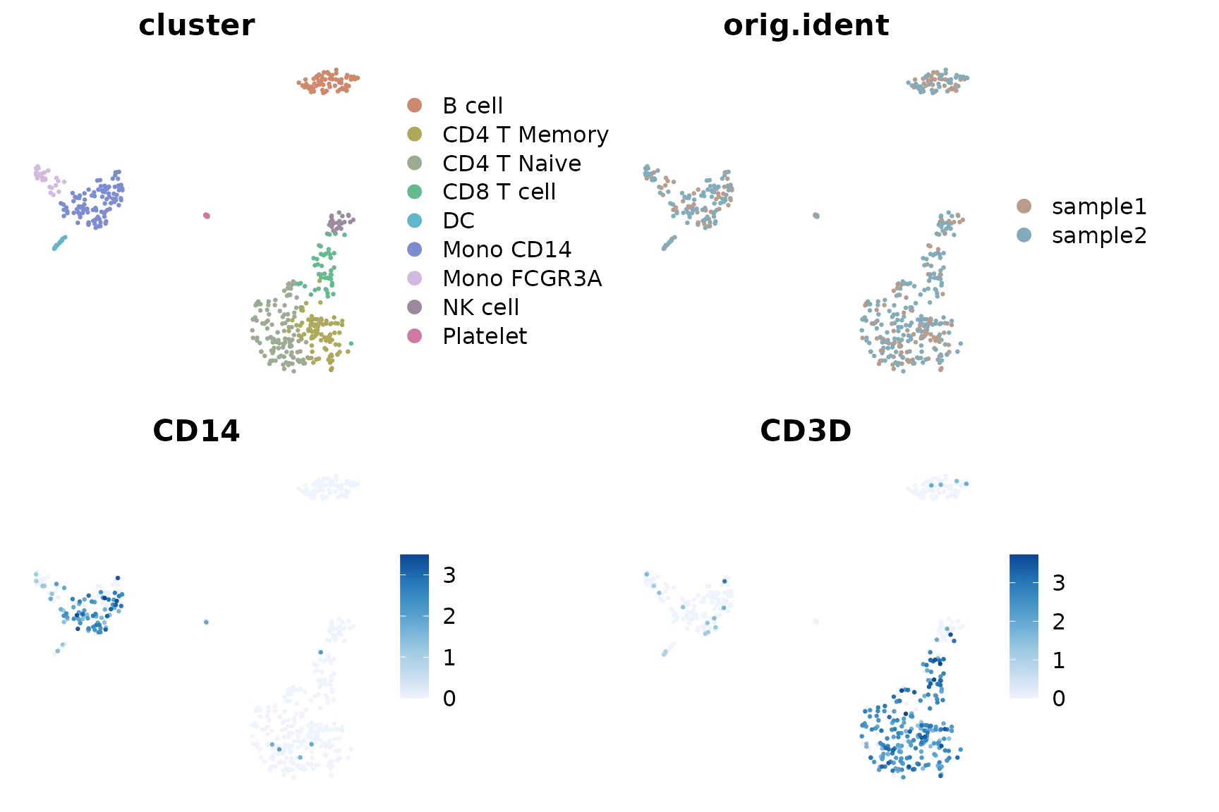 DimPlot2(pbmc, features = c("cluster", "orig.ident", "CD14", "CD3D"))