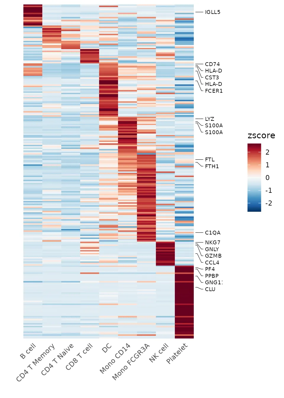 Heatmap(toplot2, lab_fill = "zscore", feature_text_subset = genes[1:20], expand_limits_x = c(-0.5, 11))