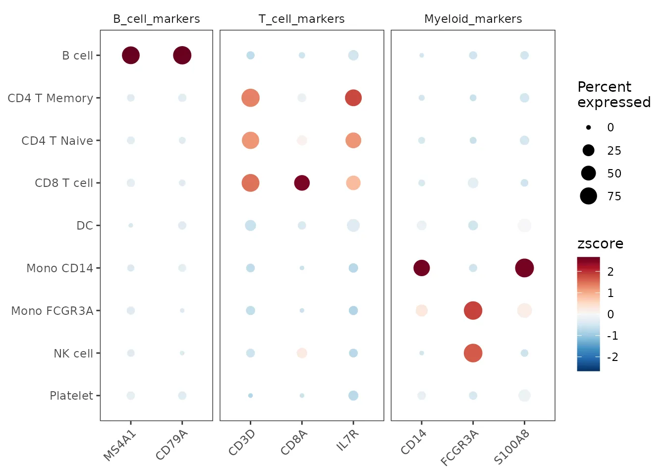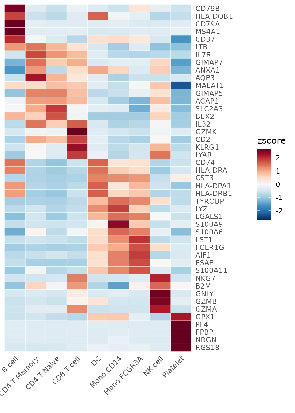 toplot <- CalcStats(pbmc, features = genes, method = "zscore")