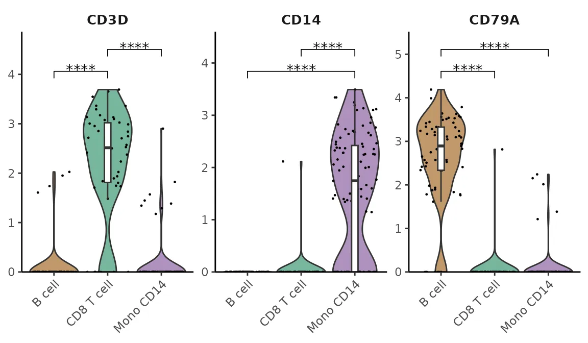 小提琴图能展示基因表达的分布特征,VlnPlot2在此基础上增加了统计分析功能: