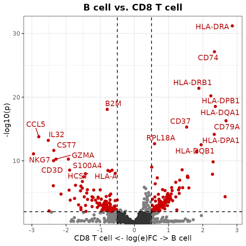 ident.1 = "B细胞", ident.2 = "CD8 T细胞",