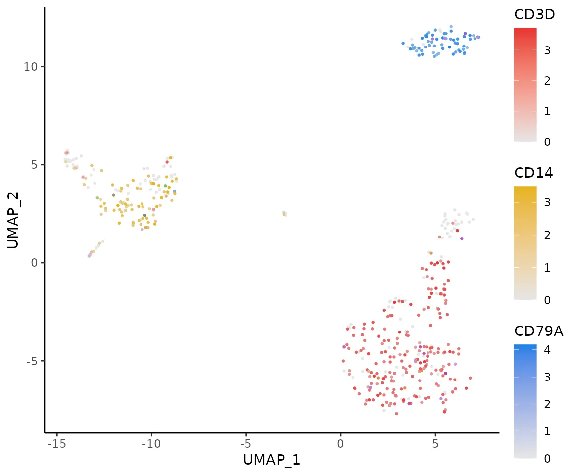 FeaturePlot3(pbmc, color = "ryb", feature.1 = "CD3D", feature.2 = "CD14", feature.3 = "CD79A", pt.size = 0.5)