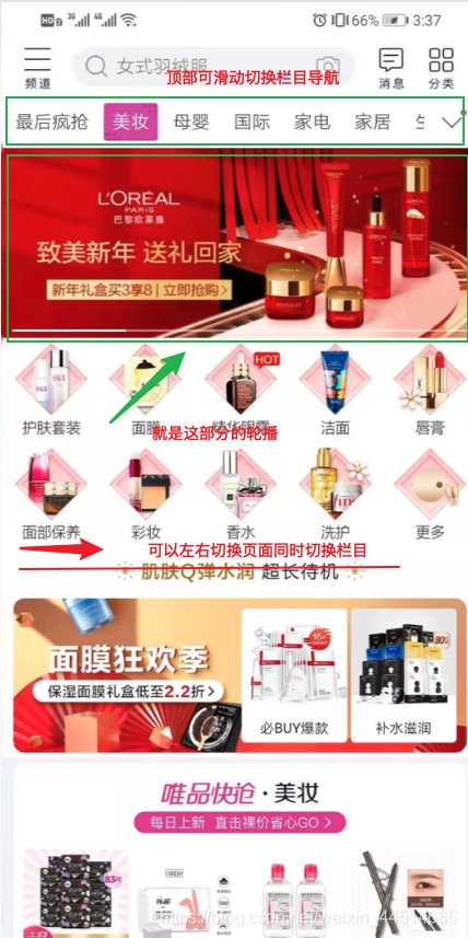 近日,接到一个需求,改善APP首页的布局,需要在顶部添加一个可滚动的栏目导航,以切换栏目然后切换栏目内容类似于唯品会目前的切换效果。如下图
