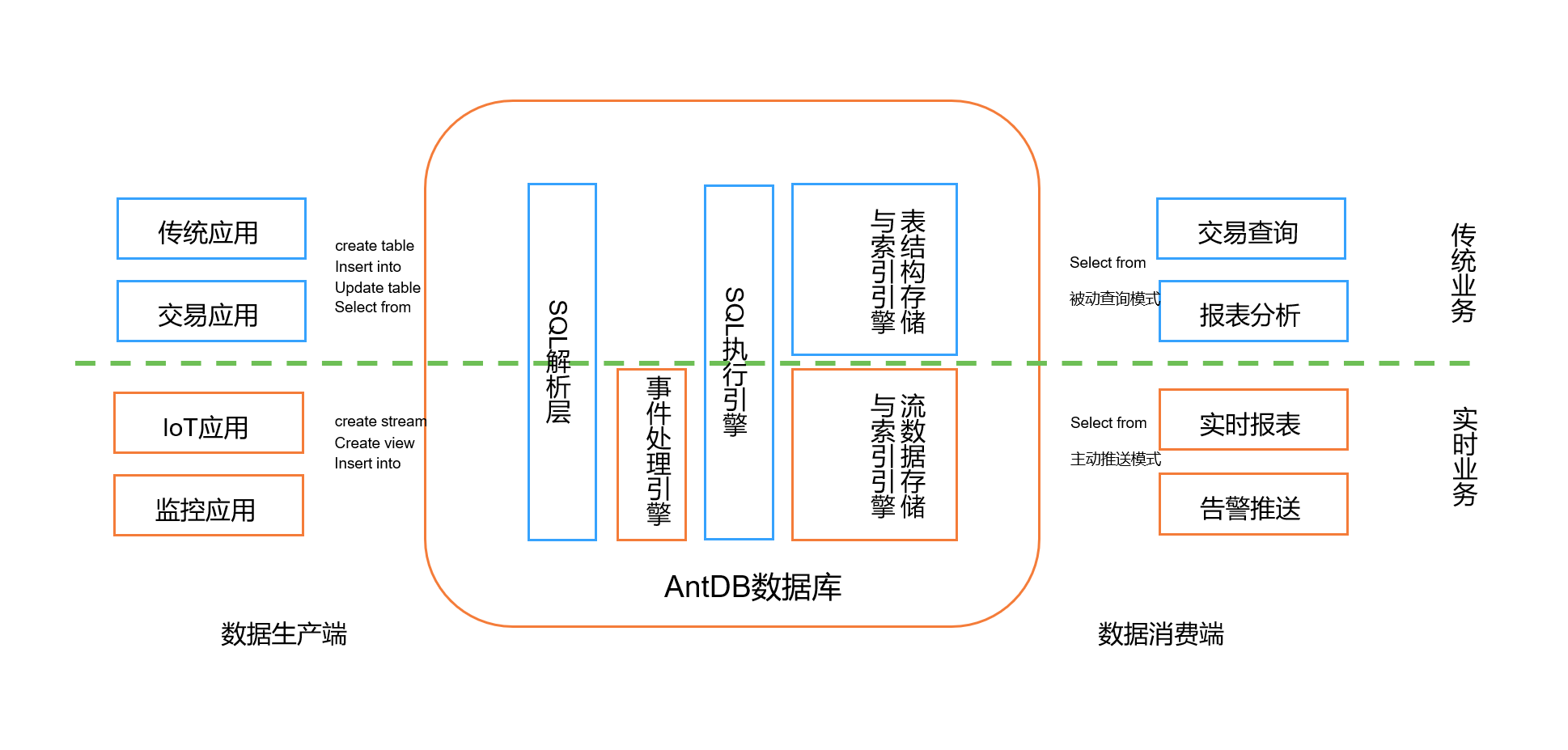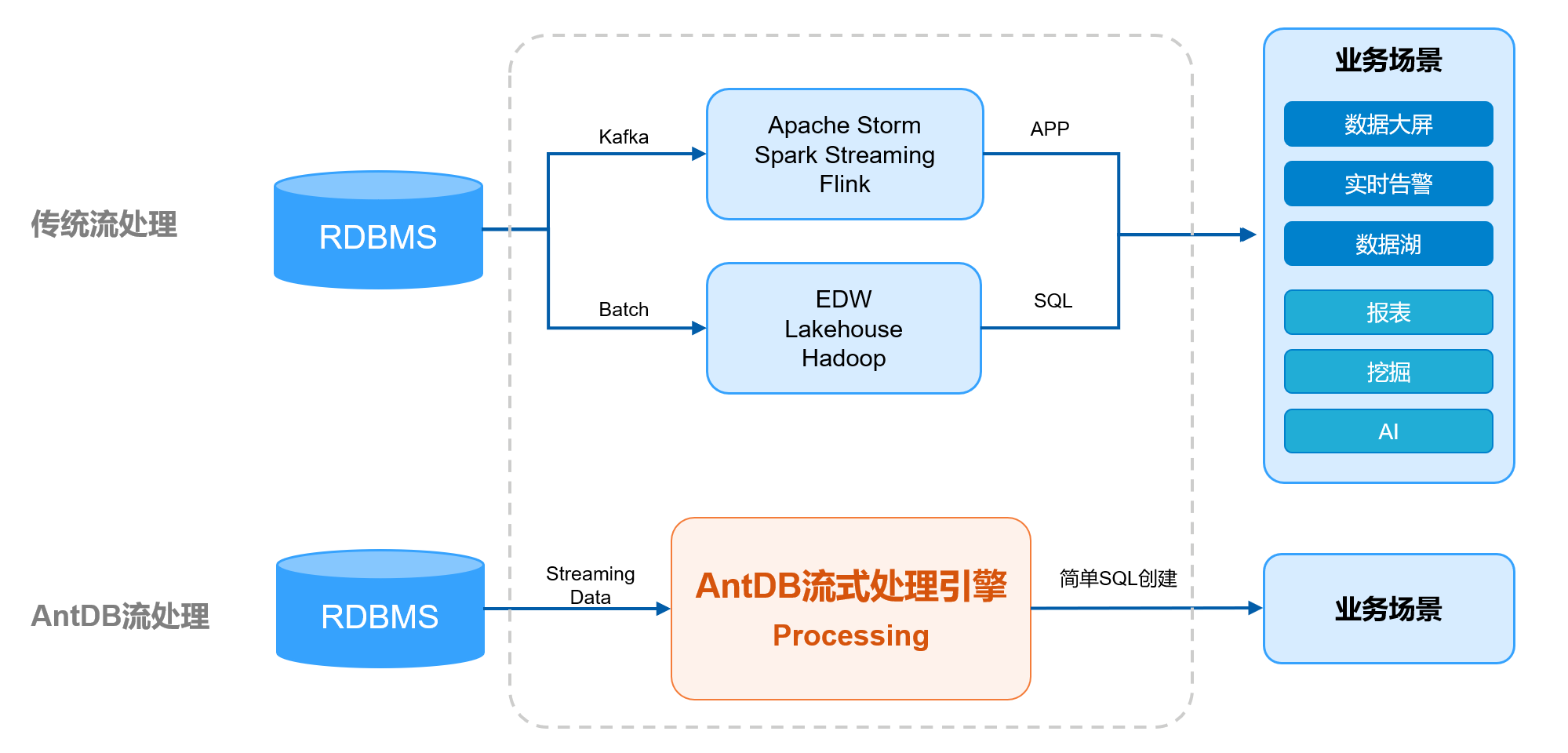 - 标准SQL定义:传统流处理方式对于SQL 的处理很弱,还要写大量业务代码,而AntDB-S可以通过统一SQL语句进行处理,流的使用上更便捷。