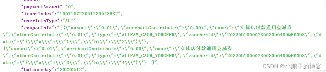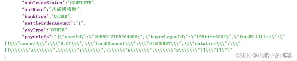 String json3 = "{\"tradeType\":\"ALI\",\"needBalance\":\"N\",\"thirdOrderNo\":\"202022051222001464051403221274\",\"reqMsgId\":\"419cea41-5dbf-4ee9-a965-b8763cf9fc70\",\"type\":\"S\",\"orderInfo\":\"订单描述999\",\"amount\":\"1\",\"paymentAmount\":\"0\",\"transIndex\":\"100110722051229943832\",\"userInfoType\":\"ALI\",\"couponInfo\":\"[{\\\"amount\\\":\\\"0.01\\\",\\\"merchantContribute\\\":\\\"0.00\\\",\\\"name\\\":\\\"实体店付款通用立减券\\\",\\\"otherContribute\\\":\\\"0.01\\\",\\\"type\\\":\\\"ALIPAY_CASH_VOUCHER\\\",\\\"voucherId\\\":\\\"2022051000073002056409QB60D3\\\",\\\"data\\\":\\\"{\\\\\\\"a\\\\\\\":\\\\\\\"1\\\\\\\",\\\\\\\"b\\\\\\\":\\\\\\\"2\\\\\\\"}\\\"},{\\\"amount\\\":\\\"0.01\\\",\\\"merchantContribute\\\":\\\"0.00\\\",\\\"name\\\":\\\"实体店付款通用立减券\\\",\\\"otherContribute\\\":\\\"0.01\\\",\\\"type\\\":\\\"ALIPAY_CASH_VOUCHER\\\",\\\"voucherId\\\":\\\"2022051000073002056409QB60D3\\\",\\\"data\\\":\\\"{\\\\\\\"a\\\\\\\":\\\\\\\"3\\\\\\\",\\\\\\\"b\\\\\\\":\\\\\\\"4\\\\\\\"}\\\"} ]\",\"balanceDay\":\"20220512\",\"signature\":\"Sq8Ysqv2rsCVA3EoNPMfhDu62Q1KAUasW9dIJL6XBfaLep7rmtRjK3MRjnXaZHb0vYDGSrlCdU1zS8V0jZZ7hAIaFJ7BF7I3wafX8AwQXiegqdkedYat9S3wND82pNqXnJJXtPp140kK3Tnm1Ok8QNFEHlPpjm3tLQCJyQdH5I8=\",\"merNo\":\"M000018491\",\"payCompleteTime\":\"20220512174819\",\"tradeStatus\":\"S\",\"orderType\":\"BUSINESS_ORDER\",\"tradeTime\":\"20220512174720\",\"subTradeType\":\"QRCODE\",\"discountsAmount\":\"1\",\"chargeRate\":\"0.002\",\"code\":\"0000\",\"platOrderNo\":\"202205122130314838OR011551331933\",\"charge\":\"0\",\"orderNo\":\"HULUPOS20220512174721P31665386927\",\"deviceNo\":\"888888\",\"channelOrderNo\":\"202205122130314838OR011551331933\",\"subTradeStatus\":\"COMPLETE\",\"merName\":\"八戒烤猪蹄\",\"bankType\":\"OTHER\",\"settleOrderAmount\":\"1\",\"payType\":\"OTHER\",\"payerInfo\":\"{\\\"userId\\\":\\\"2088912766264050\\\",\\\"buyerLogonId\\\":\\\"199****0204\\\",\\\"fundBillList\\\":\\\"[{\\\\\\\"amount\\\\\\\":\\\\\\\"0.01\\\\\\\",\\\\\\\"fundChannel\\\\\\\":\\\\\\\"DISCOUNT\\\\\\\",\\\\\\\"dataList\\\\\\\":\\\\\\\"[{\\\\\\\\\\\\\\\"A\\\\\\\\\\\\\\\":\\\\\\\\\\\\\\\"1\\\\\\\\\\\\\\\",\\\\\\\\\\\\\\\"B\\\\\\\\\\\\\\\":\\\\\\\\\\\\\\\"2\\\\\\\\\\\\\\\"}]\\\\\\\"}]\\\"}\"}";