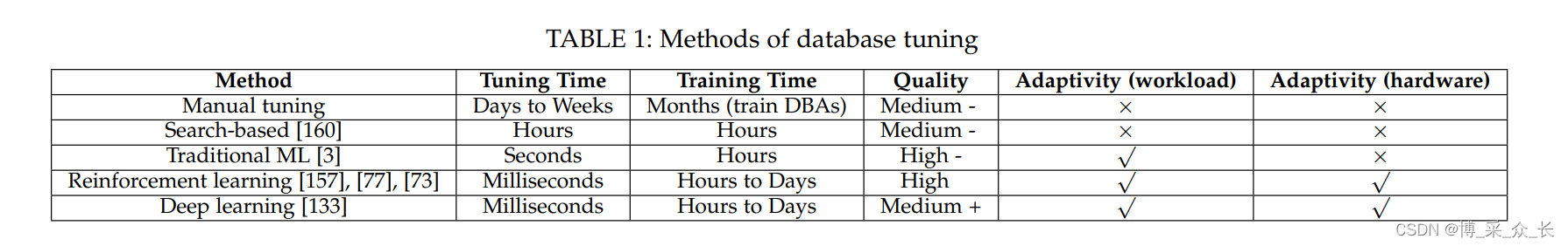 数据库和大数据分析系统有数百个可调的系统旋钮(例如Work_Mem,Max_Connections,Active_Statements),它们控制着数据库的许多重要方面(例如,内存分配、I/O控制、日志记录)。传统的手动方法利用DBA根据他们的经验手动调整这些旋钮,但他们总是花太多时间调整旋钮(几天到几周),无法处理云数据库上的数百万个数据库实例。为了解决这个问题,建议使用自调整来自动调整这些旋钮,它使用ML技术不仅可以实现更高的调整性能,而且可以缩短调整时间(从而节省人力并实现在线调整)。我们可以将现有的旋钮调整技术分为四类,包括基于搜索的调整、基于传统ML的调整、基于深度学习的调整和基于强化学习的调整。