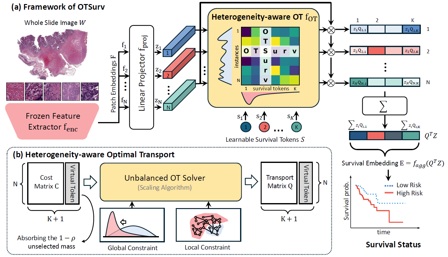 旨在通过最优传输 (OT) 方法显式建模生存预测任务中的全局和局部病理异质性,从而提高生存预测的准确性与解释性。