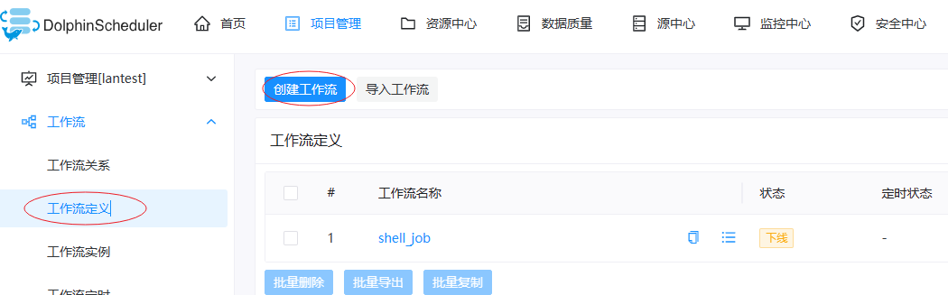 第二步,进入刚才创建好的项目,工作流定义,创建工作流