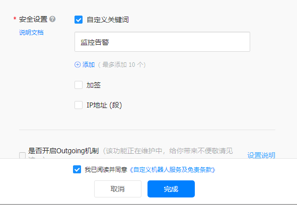 安全设置选择自定义关键词,根据需求输入关键词,我这边以“监控告警”为例