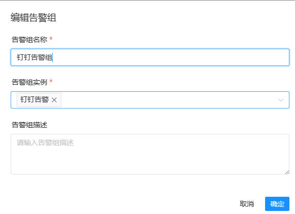 在告警组管理,添加告警组,选择刚才创建的钉钉告警实例