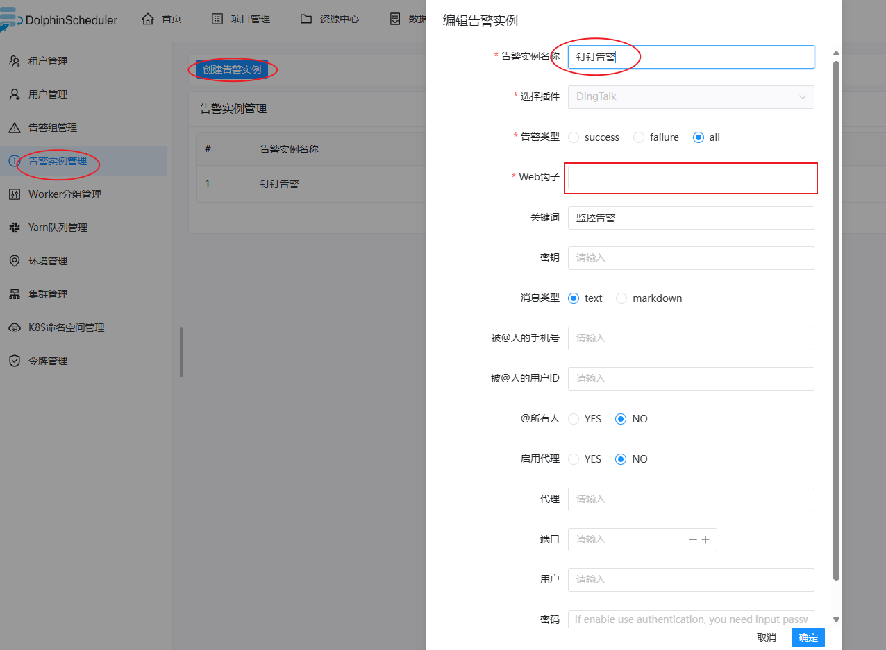 告警实例管理,创建告警实例,输入实例名称,输入Webhook,这样就添加成功了