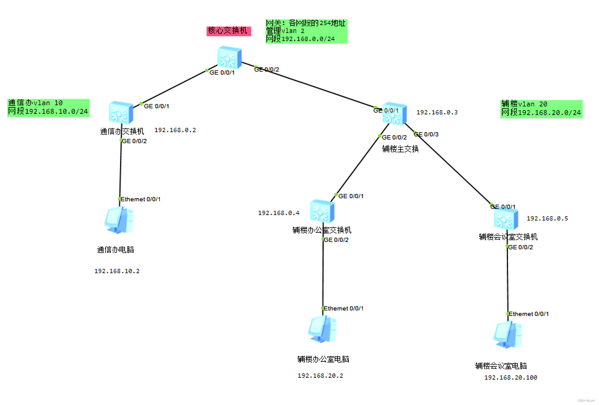 工作随记1:搭建一个简单局域网,并配置远程管理 搭建一个简单局域网并进行VLAN划分,实现VLAN间通信。为主要交换机配置远程地址,并开启telnet功能。主要设计:基于端口划分vlan;基于子网划分vlan;配置telnet;