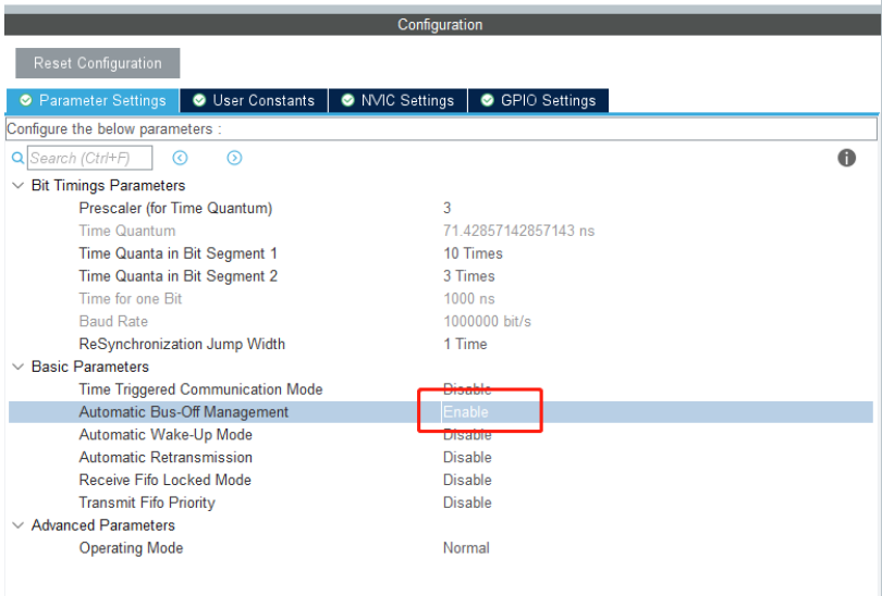 接着将Basic Parameters中Automatic Bus-Off Management进行使能,作用是当Can总线长时间接受不到信号会自动进入低功耗模式,检测到信号自动唤醒。