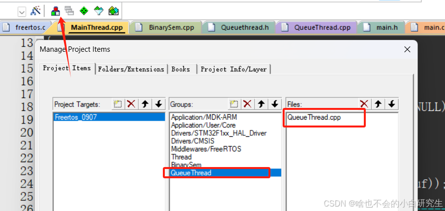 在Keil 5内添加Queuethread.cpp、Queuethread.h: