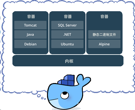 - **首先,鲸鱼是操作系统。**要交付的应用程序是各种货物,要将各种形状和尺寸不同的货物放到大鲸鱼上,得考虑每件货物怎么安放(应用程序配套的环境),还得考虑货物和货物之间能否重叠起来(应用程序依赖的环境是否会冲突)。