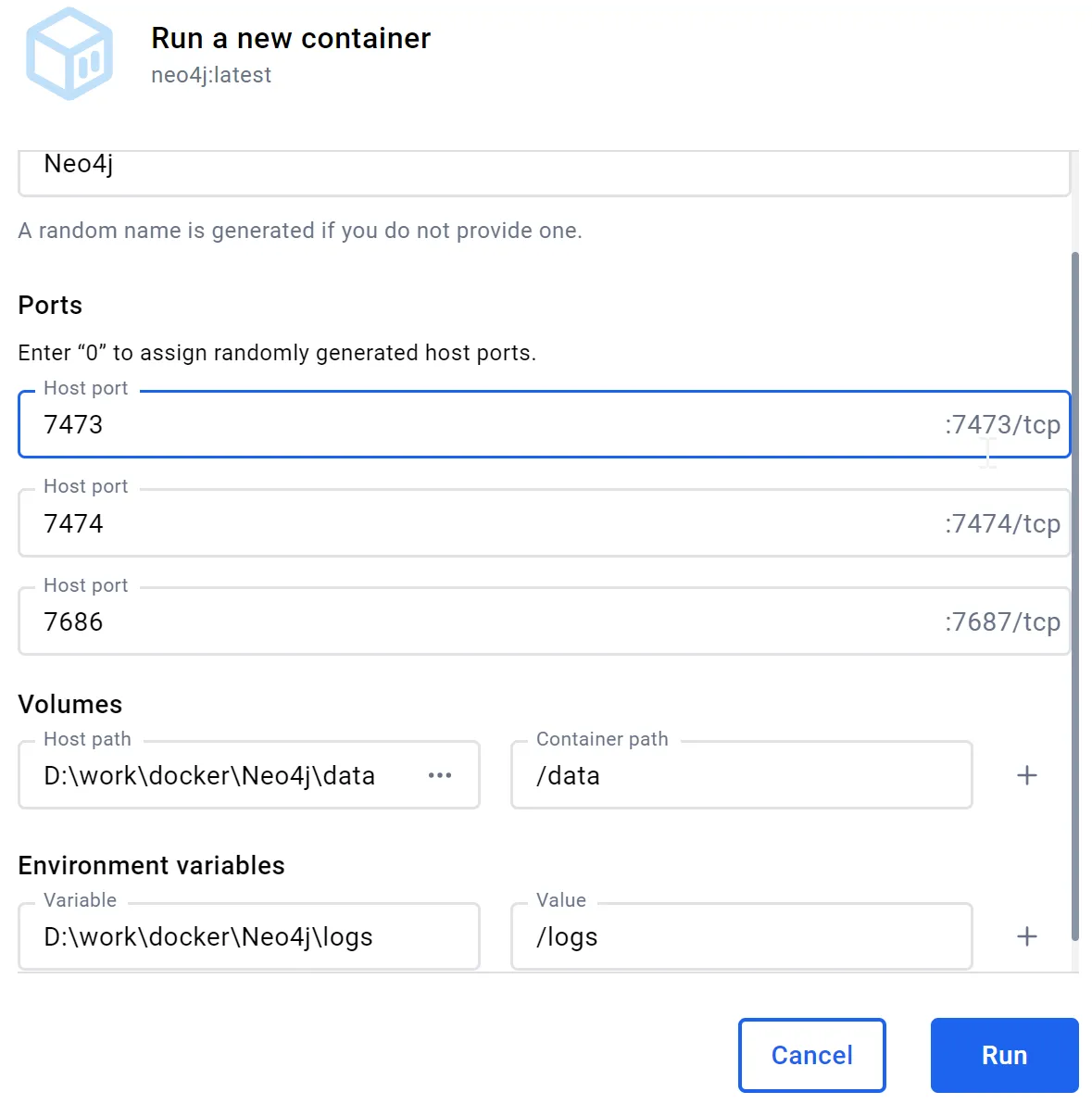 打开 Docker Desktop 界面,找到 Neo4j 镜像,点击Run,配置参数: