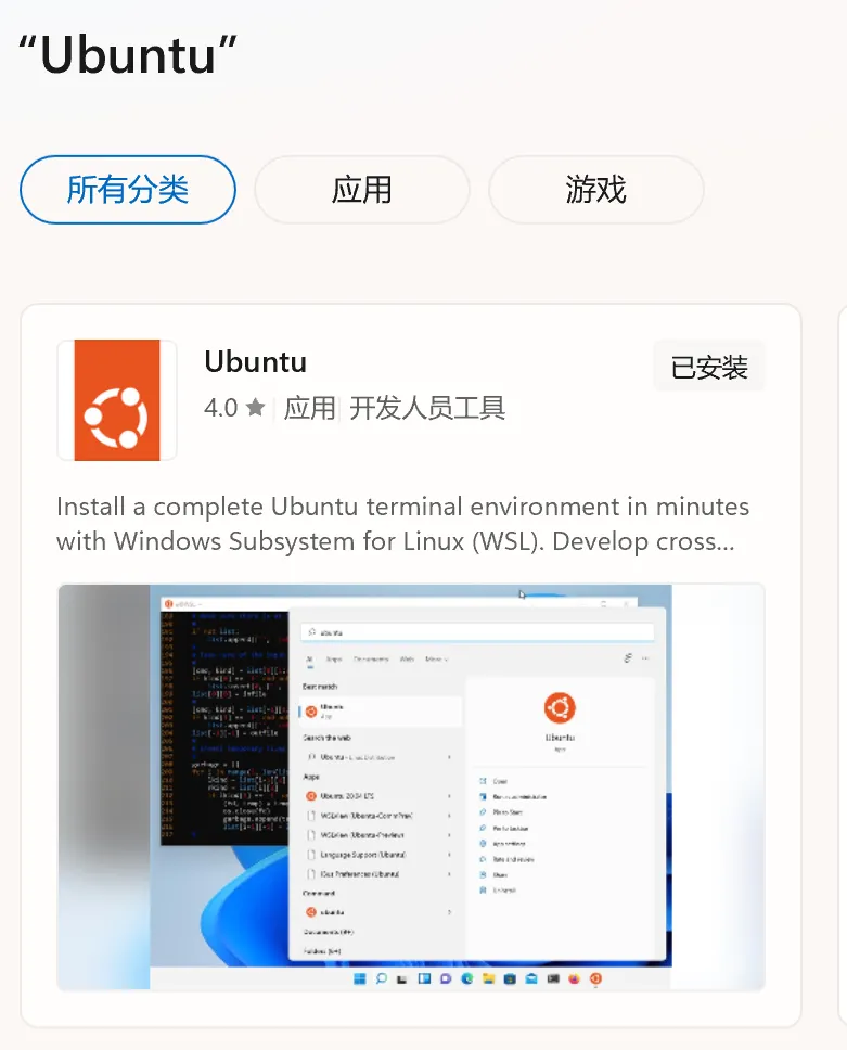 打开 MicroSoft Store,搜索 Ubuntu,点击进行安装:
