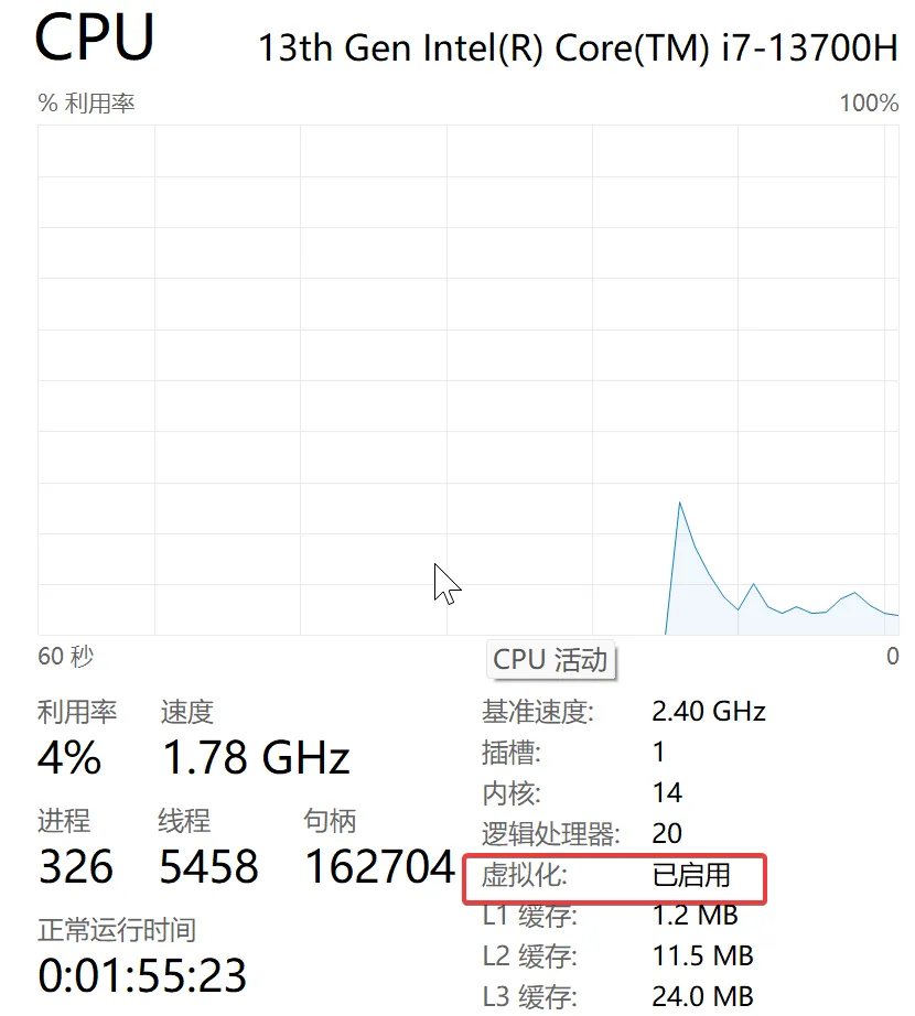 打开 任务管理器 -> 性能 -> CPU,查看虚拟化是否开启: