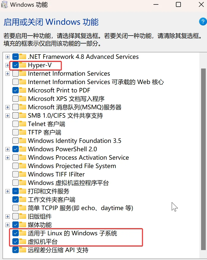 - 确保虚拟化所需的 Windows 功能服务已经开启