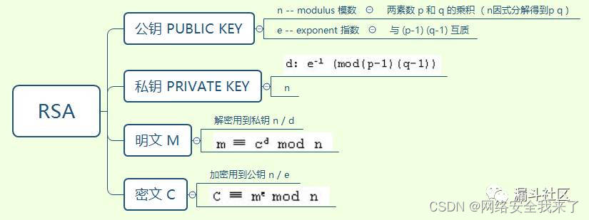 RSA是一种非对称加密算法,它由 公钥(n/e),私钥(n/d),明文M和密文C组成。我们做CTF题目时,一般题目中会给出公钥和密文让我们推出对应的私钥或者明文。RSA的相关公式都写在上面脑图中,在正式讲解RSA加密算法前我们先来普及一波数学的基本知识。