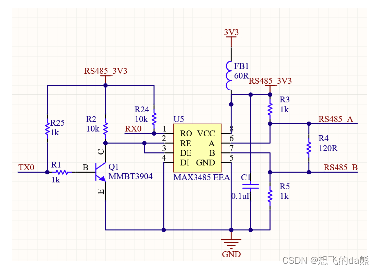 接收:默认没有数据时,TX为高电平,三极管导通,RE低电平使能,RO收数据有效,芯片max485为接收状态。