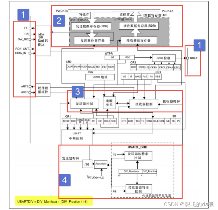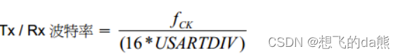 fck为 给外设的时钟, USARTDIV 是一个无符号的定位数,这12的值在波特率寄存(USART_BRR)中进行配置。