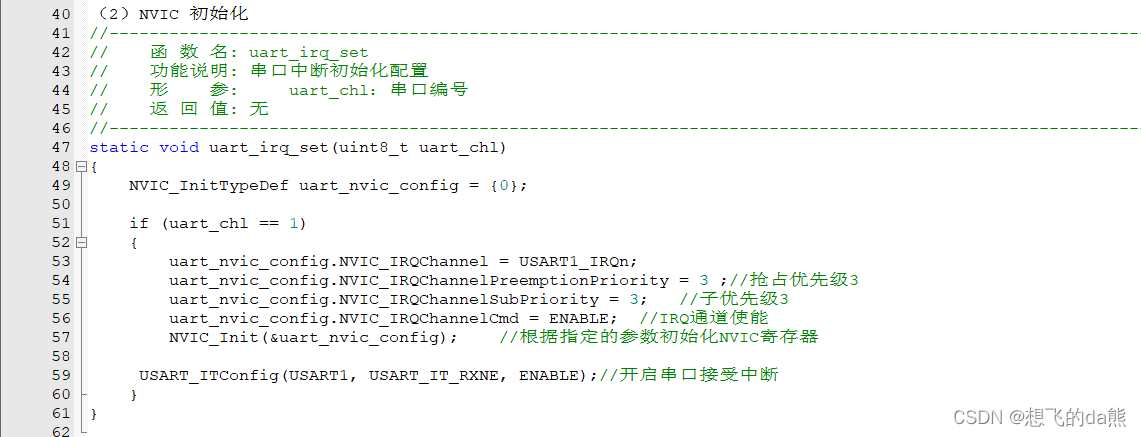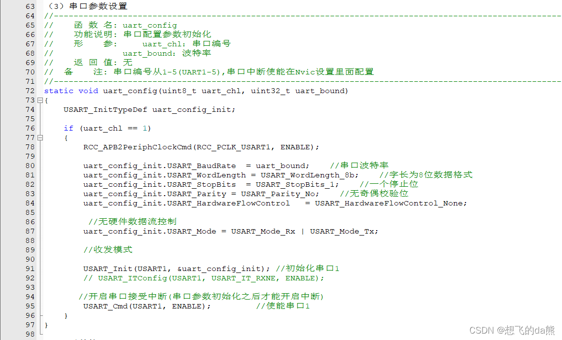 USART 有专门控制发送的发送器、控制接收的接收器,还有唤醒单元、中断控制等等。使用 USART 之前需要向 USART_CR1 寄存器的 UE 位置 1 使能 USART,UE 位用来开启供给给串口的时钟。发送或者接收数据字长可选 8 位或 9 位,由 USART_CR1 的 M 位控制。发送器当 USART_CR1 寄存器的发送使能位 TE 置 1 时,启动数据发送,发送移位寄存器的数据会在 TX 引脚输出,低位在前,高位在后。