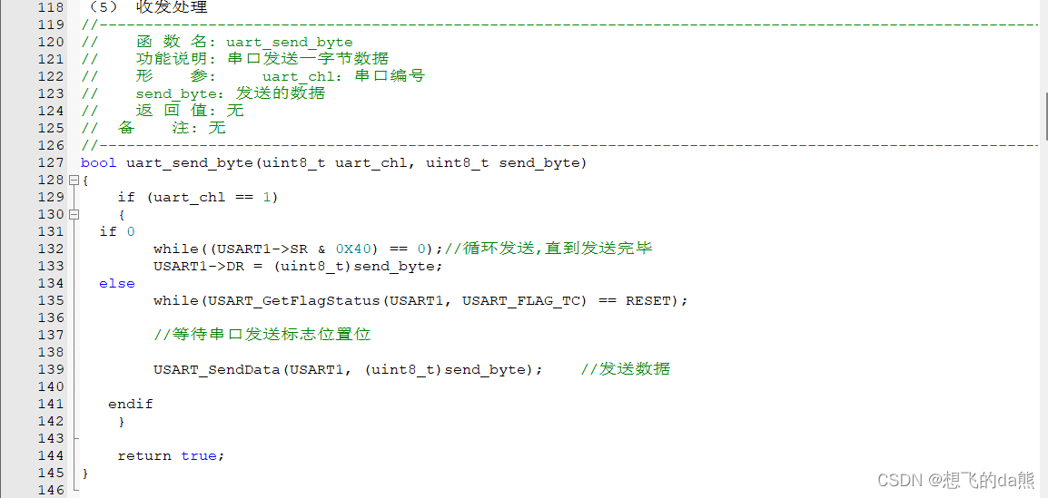如果是同步模式 SCLK 也输出时钟信号。一个字符帧发送需要三个部分:起始位+数据帧+停止位。起始位是一个位周期的低电平,位周期就是每一位占用的时间;数据帧就是我们要发送的 8 位或 9 位数据,数据是从最低位开始传输的;停止位是一定时间周期的高电平。停止位时间长短是可以通过 USART 控制寄存器2(USART_CR2)的 STOP[1:0]位控制,可选 0.5 个、1 个、1.5 个和 2 个停止位。默认使用 1 个停止位。2 个停止位适用于正常USART 模式、单线模式和调制解调器模式。0.5 个和 1.5 个停止位用于智能卡模式。