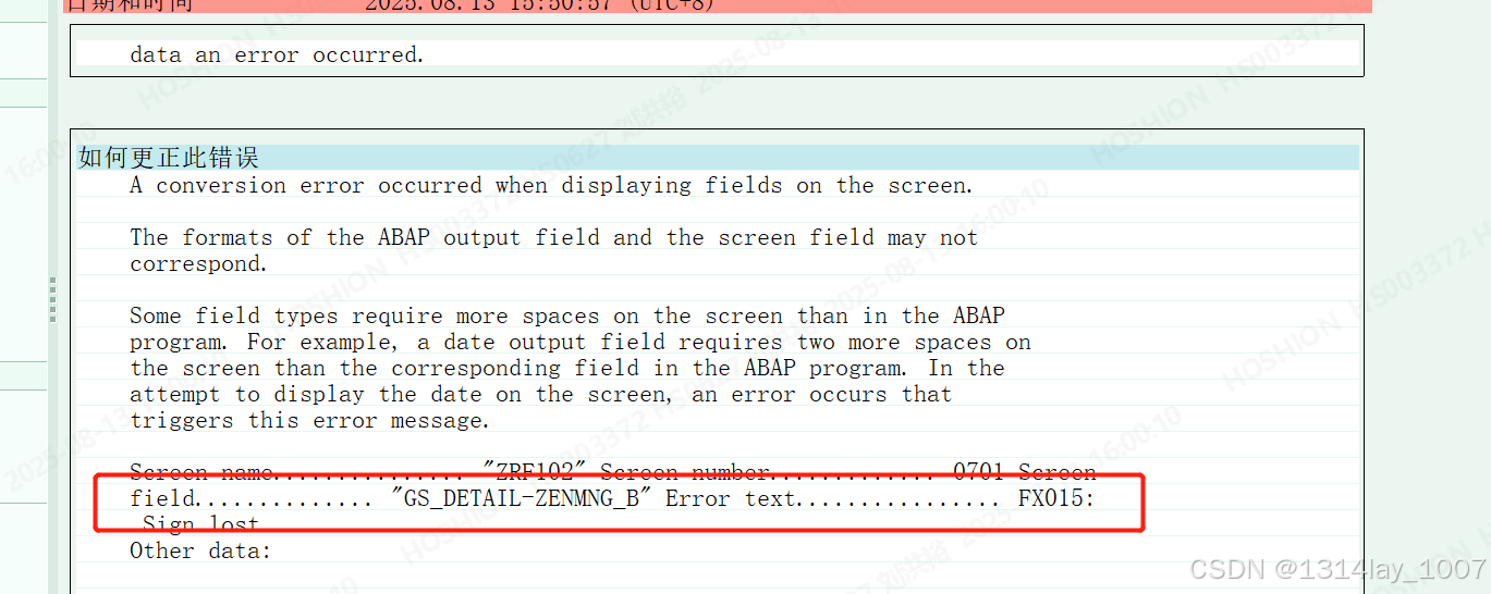 - 屏幕字段显示空间不足时(如日期字段需要比ABAP程序多2个字符)也会引发同类错误2