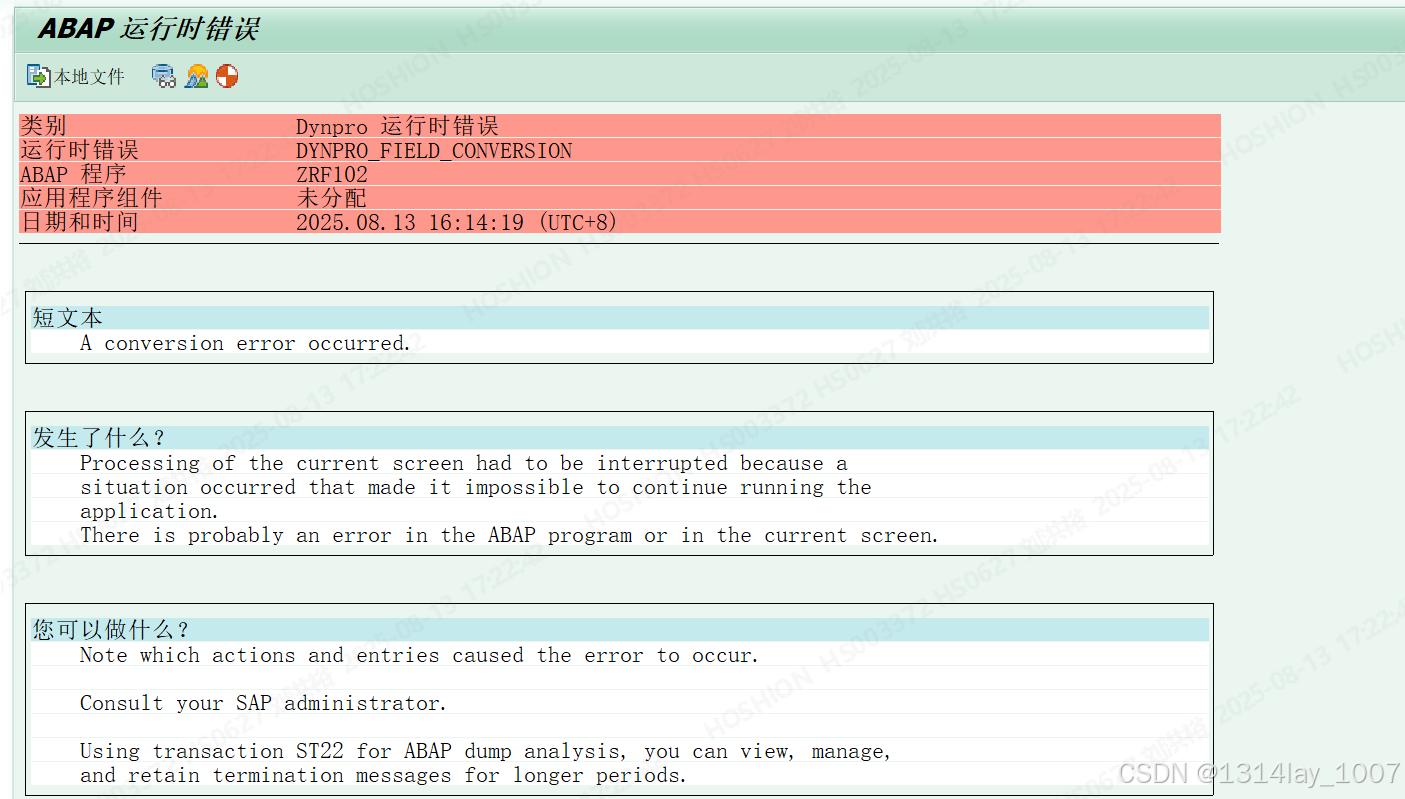 DYNPRO_FIELD_CONVERSION是SAP系统中常见的运行时错误,主要与屏幕字段的数据类型转换问题相关。以下是该错误的详细解析: