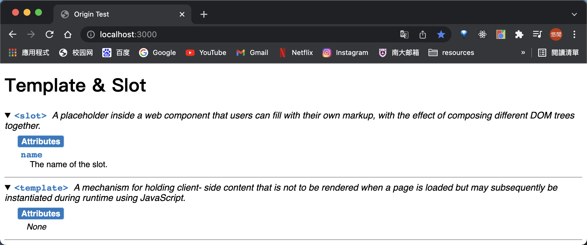 首先先在 html 写好我们要的标签(如果当前浏览器不支持 Web Components 或是自定义标签尚未注册时,则会作为默认标签处理)