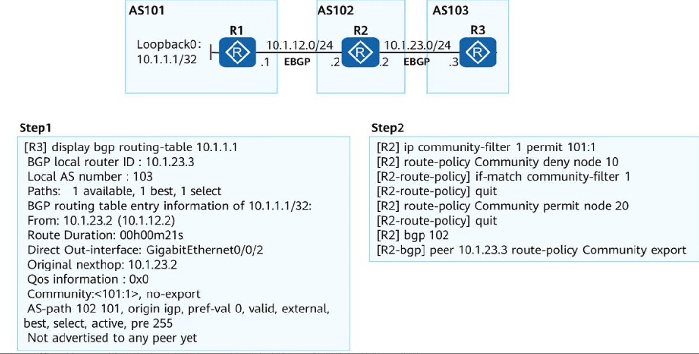 如图所示,AS101、AS102、AS103 间通过 BGP 实现互通,其中 R1 与 R2、R2 与 R3 分别建立 EBGP 邻居关系。R1 对 10.1.1.1 的路由添加团体属性 <101:1>,R3 对 10.1.1.1 的路由追加团体属性 < no - export>,某工程师通过 Step1 查看 R3 关于路由 10.1.1.1 的表项。后来该工程师又在 R2 进行了 Step2 的相关配置。关于上述场景,以下描述正确的是?