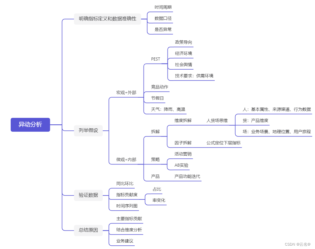 一般来说,先假设再验证是一篇完整数据异动分析的主要内容。这里我列举了两个大方向:宏观+外部、微观+内部。