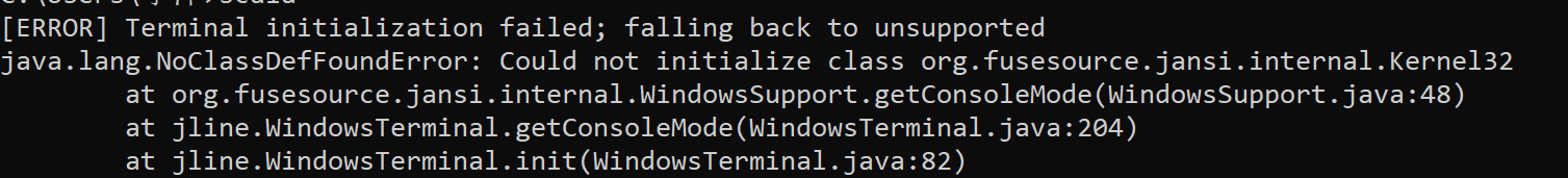 Scala运行环境报错 NoClassDefFoundError: Could not initialize class org.fusesource.jansi.internal.Kernel32 Windows11 Scala运行环境报错