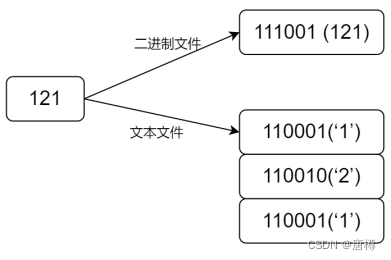 文件有两种保存方式:二进制文件、文本文件。例如存121这个数字。