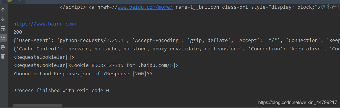 response.url响应的url;有时候响应的url和请求的url并不一致response.status_code响应状态码response.request.headers响应对应的请求头response.headers响应头response.request._cookies响应对应请求的cookie;返回cookieJar类型response.cookies响应的cookie(经过了set-cookie动作;返回cookieJar类型response.json()自动将json字符串类型的响应内容转换为python对象(dict or list)