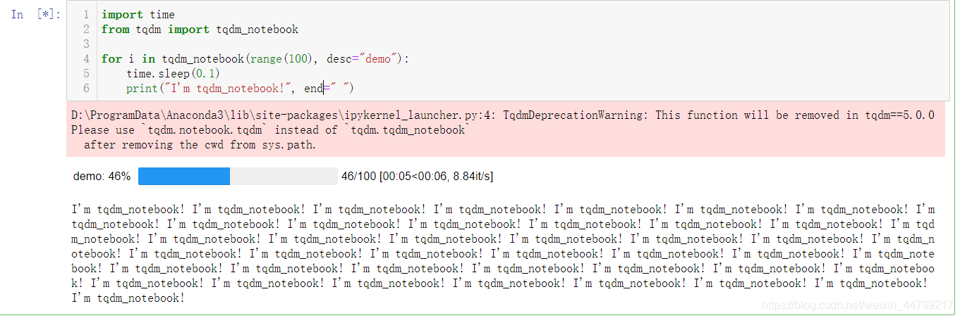 可以看到,当我们的代码的运行需要较长时间时,进度条可以很好的帮助我们了解整个代码的运行进度。