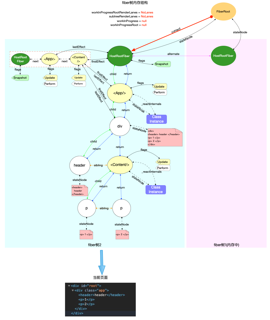 首次构造或者是对比更新, 最终都会在内存中生成一棵用于渲染页面的fiber树(即fiberRoot.finishedWork). - 这棵将要被渲染的
