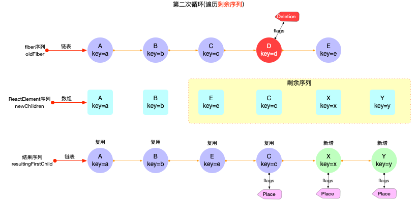 fiber(E), fiber(C)可以复用. 其中fiber(C)节点发生了位移(打上Placement标记). fiber(X), fiber(Y)是新增(打上Placement标记).- 同时