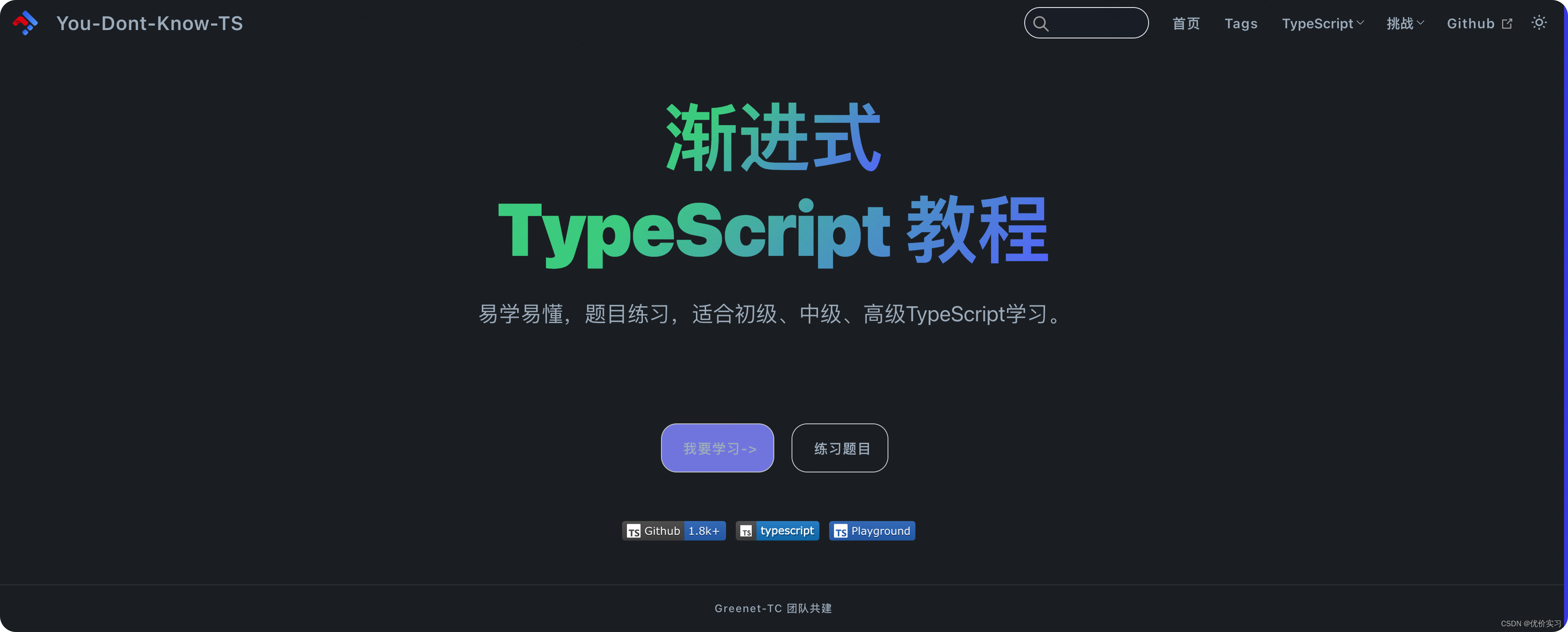 完整的Typescript,由简单到复杂,复杂重点类型操作、联合类型等通过动画和照片形式展示,更容易理解。丰富题目:分位简单,中等、苦难,有简到难。在线编辑器,用于练习,极其方便。