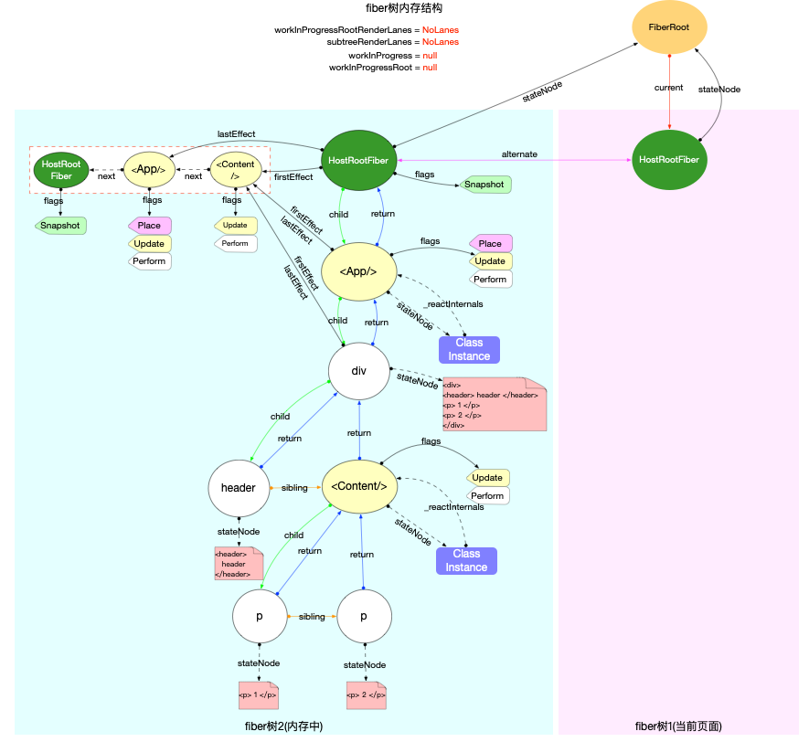 本节演示了更新阶段fiber树构造(对比更新)的全部过程, 跟踪了创建过程中内存引用的变化情况. 与初次构造最大的不同在于fiber节点是否可以复用, 其中bailout逻辑是fiber子树能否复用的判断依据.
