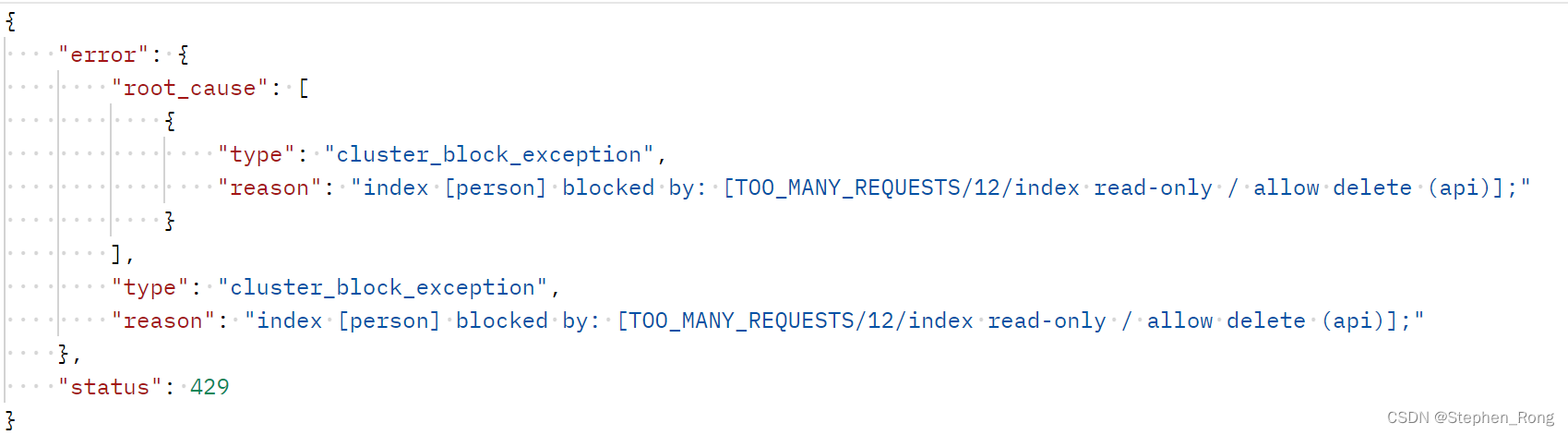 解决ElasticSearch出现status 429的问题 其中位置换成你自己的elasticsearch的集群地址即可,比如我在本地部署的,那就直接替换成127.0.0.1 ,即127.0.0.1:9200/_all/_settings。这里的 read-only / allow delete (api) 说明目前索引的操作权限只有读和删除,无法进行修改操作,所以我们使用命令修改掉这条限制即可。附上问题response。