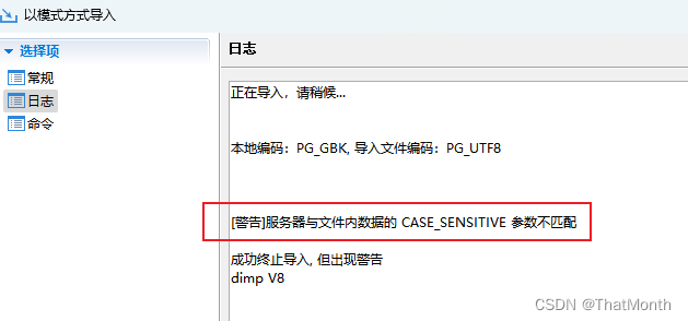 当我们想用dmp文件来导入数据时,可能会遇到这种报错:[警告]服务器与文件内数据的 CASE_SENSITIVE 参数不匹配,成功终止导入, 但出现警告
