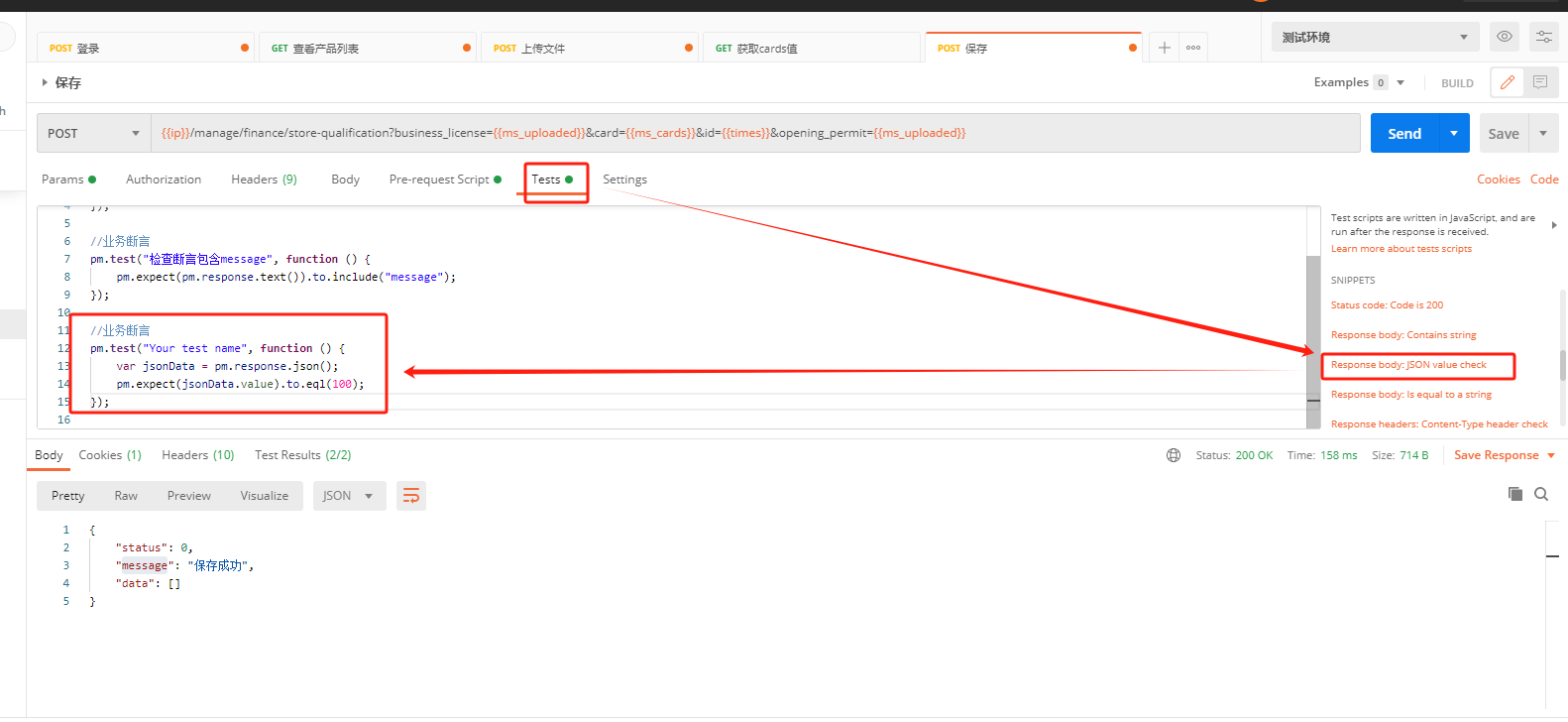 在Tests页面,点击右边的Response body: JSON value check,即可看到对应的断言代码出现