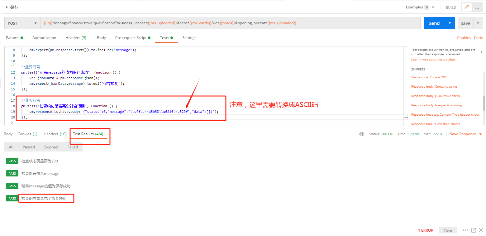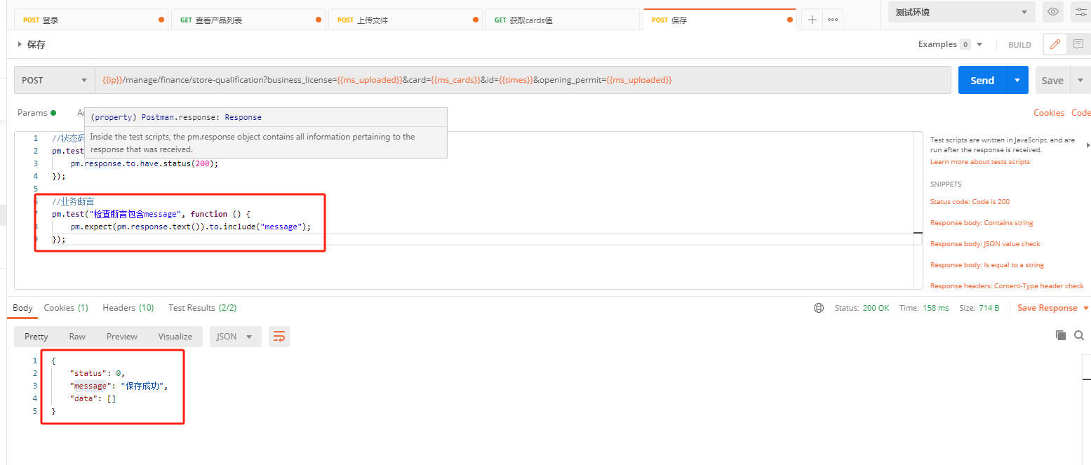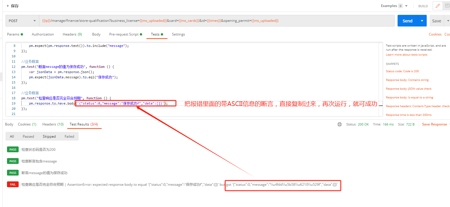 可修改提示信息,例如断言message的值为保存成功,可修改为: