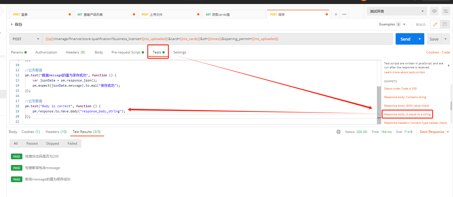 在Tests页面,点击右边的Response body: Is equal to a string,即可看到对应的断言代码出现