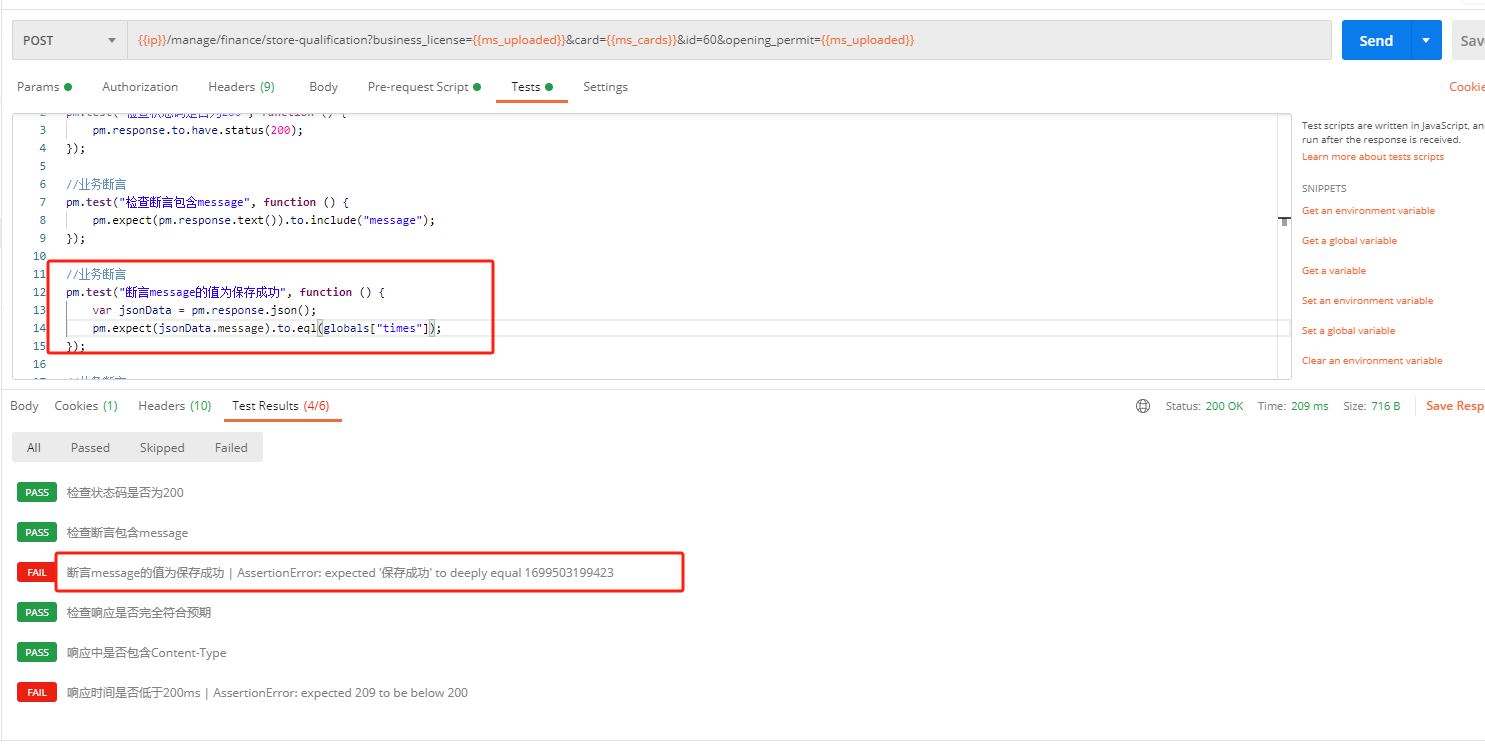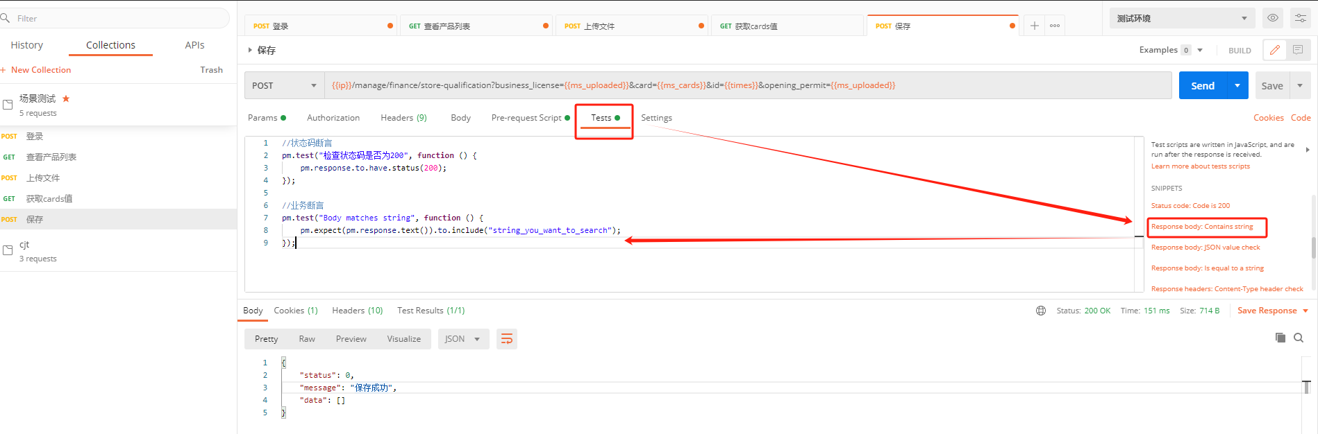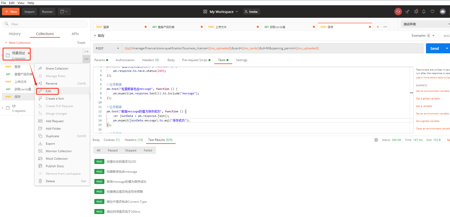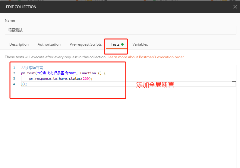 选中集合,点击编辑Edit,在Tests中添加全局断言