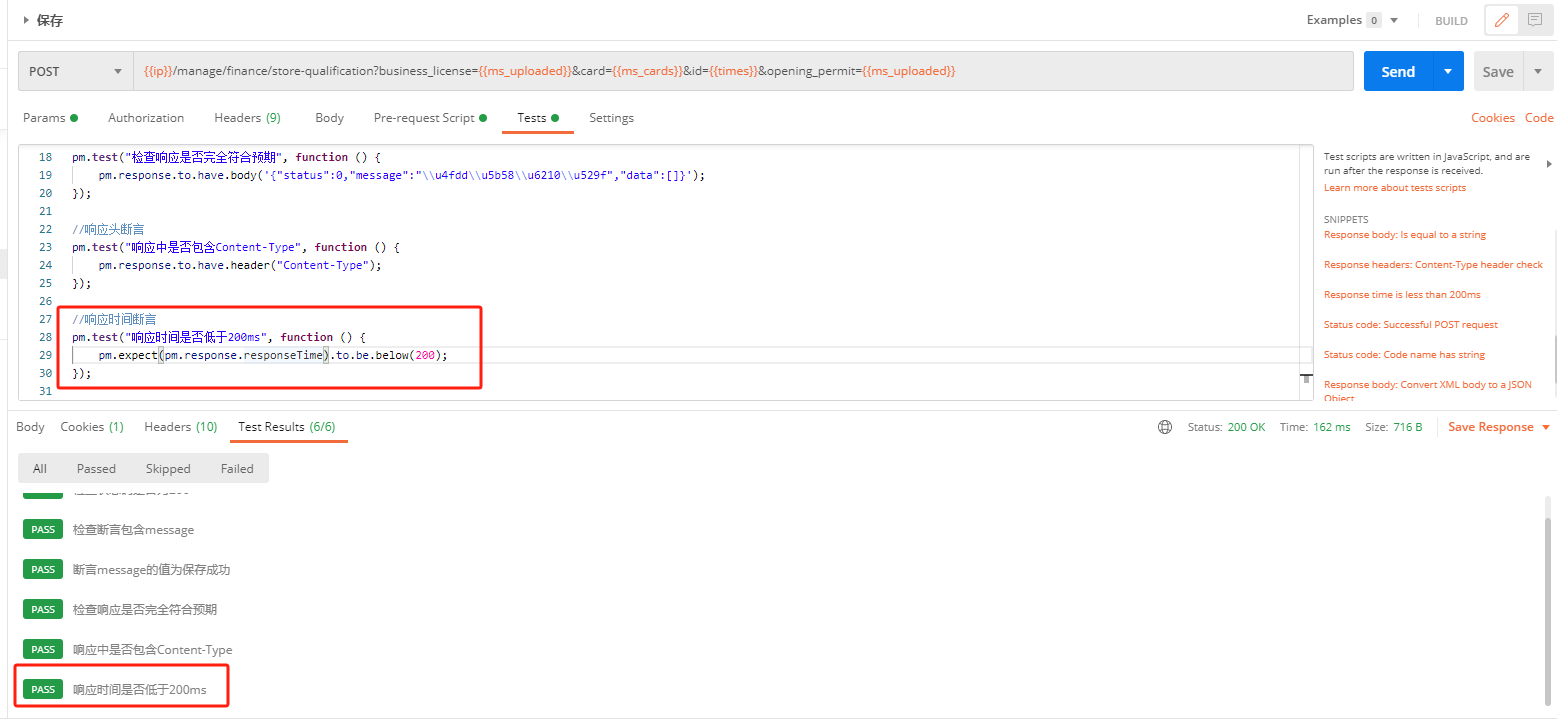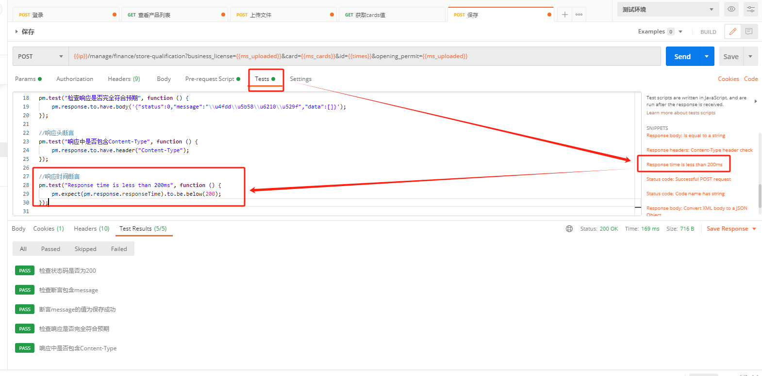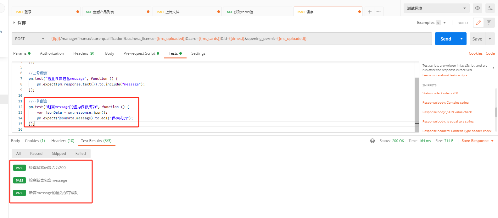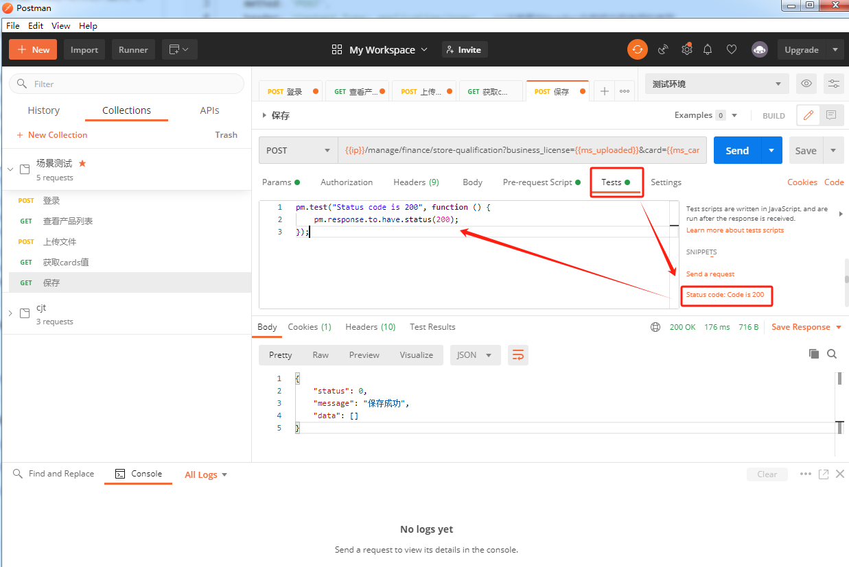 在Tests页面,点击右边的Status code: Code is 200,即可看到对应的断言代码出现